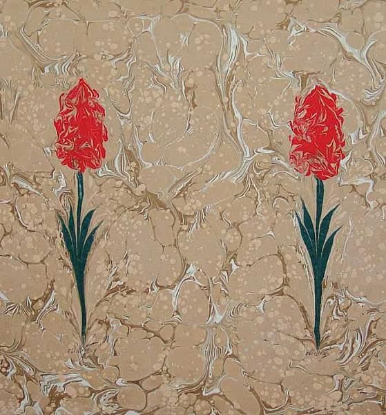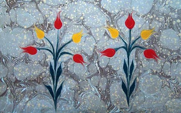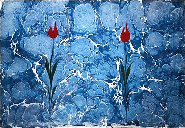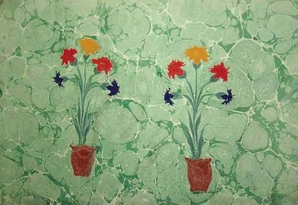 Editor: So, this watercolor painting, titled "Buket" by Mustafa Duzgunman, immediately strikes me as…serene? There’s something very calming about the swirling blue background contrasting with the pops of colour in the floral arrangement. What is your take? Curator: That's an interesting starting point. What draws me in is considering where this type of decorative-art might have been displayed or purposed historically. Think about it – this style connects with broader traditions of ornamental arts across cultures, and specifically resonates with a craft called "Ebru" in Turkey and Central Asia: what purpose did they serve, and how has its role in society evolved? Editor: That’s interesting! I’m not familiar with Ebru. So, these decorative works, you mean, could have had practical uses beyond being pretty to look at? Curator: Precisely! Consider how the "water colours" were utilized, how it could be integrated into bookbinding or calligraphy panels and their public roles at that time. This helps contextualize both their inherent artistic worth and social significance. This forces us to acknowledge its original cultural implications while also appreciating its aesthetic features. Do you observe any other qualities? Editor: Well, beyond the relaxing colours, I noticed the composition. Two bouquets mirroring each other... that sense of symmetry, perhaps a cultural value of order and balance. Curator: Yes, a wonderful point. Symmetry definitely emphasizes a structured artistic intention and possibly symbolizes cultural notions that prized equilibrium in various social facets – but, considering also our modern eyes, how might contemporary sensibilities challenge or reinterpret those historic artistic structures? Editor: I suppose we tend to focus on individuality and unique expression more today. Curator: Right, so, engaging this 'Buket', while understanding its heritage can provoke vital debates about shifting artistic interpretations across diverse communities. Food for thought? Editor: Absolutely, seeing it less as *just* a pretty picture and more as a cultural artifact – it shifts my perspective completely. Curator: Exactly. These explorations and insights not only enrich our appreciation but also motivate much-needed reassessments concerning art and historical interactions.