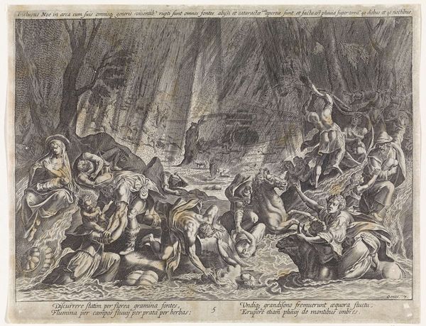 Editor: This is "Winterlandschap met winterse activiteiten" – or "Winter Landscape with Winter Activities" – made sometime between 1600 and 1634. It's on display here at the Rijksmuseum and attributed to Johan Barra. The texture created by the ink and the composition feel very busy. What can you tell me about this work? Curator: The scene hums with activity, doesn’t it? It’s more than just a depiction of daily life. Look at the symbols etched into the sky above – the leaping horse, the stylized plant form. These aren’t accidental. They function as a kind of visual language. They represent cultural ideals or societal hopes. Do you notice how the figures engage in labor while others seemingly idle nearby? Editor: I do. There's a woodcutting scene up front and in the distance, figures skating on what looks like a frozen canal. Curator: Precisely. And within these activities, we can explore the values this society places on work, leisure, and community. The winter season itself becomes symbolic. Consider what winter represents – dormancy, hardship, but also communal resilience. What emotional tones are evoked for you, as you consider what the symbols represent? Editor: Well, seeing everyone working together, even in a harsh environment, I feel both a sense of hope and a bit of anxiety about enduring the cold! It makes me think about what gives a community strength to persevere. Curator: Indeed. So, it becomes clear that this seemingly simple landscape speaks volumes about the psychological landscape of its time, holding within it cultural memory and values concerning human effort. This scene acts like a microcosm of a community's enduring spirit, portrayed through symbols. Editor: I had not noticed how the symbolism enriches this landscape; now it makes me think differently about winter scenes. Curator: Visual symbols act like hidden codes; they reveal cultural continuity.