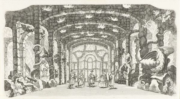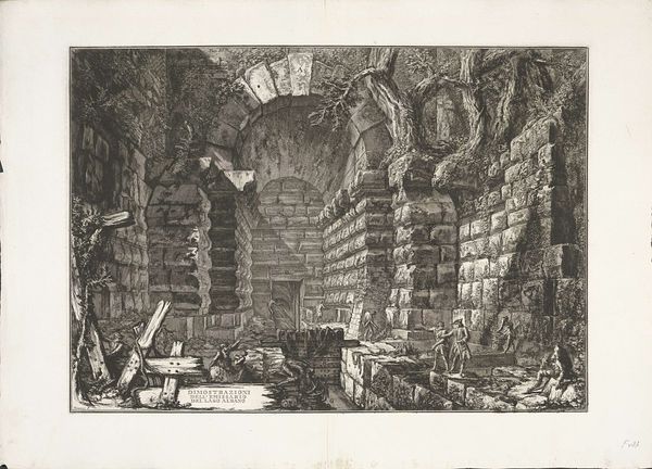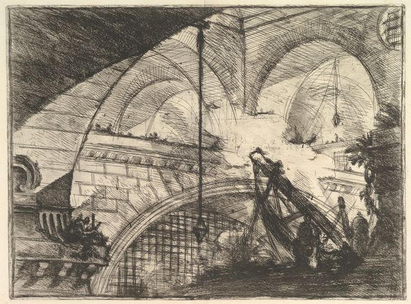 Giovanni Battista Piranesi created "The Sawhorse" as part of his "Imaginary Prisons" series. The etching teems with labyrinthine architecture, evoking feelings of awe and claustrophobia. Piranesi masterfully uses line to create depth and detail. The crisscrossing of lines in the arches and vaults creates a complex interplay of light and shadow, enhancing the nightmarish quality. The monumental scale of the architecture dwarfs the tiny figures, emphasizing the overwhelming and oppressive nature of the space. The sawhorse in the foreground adds a touch of the mundane, contrasting with the fantastical setting. Piranesi challenges Enlightenment ideals of reason and order by creating an irrational space that upends conventional perspective, reflecting anxieties about power and confinement. The print invites us to reflect on the darker aspects of the human condition.