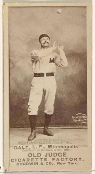 This 1889 photograph of Milton Douglas "Buck" West, a baseball player for Minneapolis, was made by Goodwin & Company as an advertisement for Old Judge Cigarettes. Its intention was to associate smoking with sporting prowess. The image, created in a burgeoning era for professional baseball in the United States, presents West in his uniform holding a bat, a heroic stance for the modern age. The "M" emblazoned on his shirt identifies him with Minneapolis, fostering local pride and a sense of community through baseball fandom. Produced by a cigarette company, this card reflects the commercialization of sport, where players and their images became commodities to promote consumer products. Studying photographs such as these allows us to examine the historical relationship between sport, commerce, and identity in the United States. Primary source documents, such as newspapers, advertisements, and company records, provide additional layers of understanding about the social conditions that gave rise to this form of cultural production.