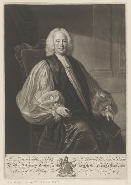 Editor: This is a portrait of Johann Georg Volckamer from 1736, etched by Bernhard Vogel. It's a striking image; the wig and draping fabric give it such a sense of formality, of status. How do you interpret this work, considering its historical context? Curator: Portraits during this period were often powerful tools for constructing and reinforcing social hierarchies. Look at the details: the powdered wig, the luxurious robe, even the book. They speak volumes about Volckamer's position within 18th-century society. But what do they conceal? What about the realities of labour and inequality that supported this elite lifestyle? Does this image present a complete picture? Editor: That's a great point. We're seeing a very carefully curated image. Curator: Exactly. It's interesting to think about how portraits like this, while seemingly objective representations, participate in the construction of power. Volckamer, as "Senior Primarius," likely held considerable influence. Who benefited from that influence? Whose voices were silenced in the process? Consider also the historical context - what global events were taking place as this portrait was created, and how might Volckamer have been implicated in those? Editor: It’s almost like reading between the lines, looking at what's not being said. Curator: Precisely. It encourages us to question the narratives we inherit and consider whose perspectives are missing. These portraits reinforce notions of identity and value rooted in privileged, and can be useful tools in understanding both history and today’s society. Editor: This has completely changed how I see this portrait, I now see this portrait through its time in society! Curator: It’s a continuing process of understanding the historical dimensions and lasting significance of such works.