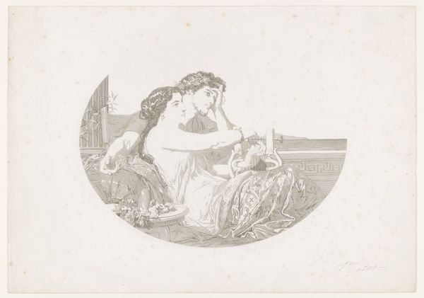 Curator: Just look at this engraving by Gustave Joseph Biot! It’s called "Aglaé en Bonfatius van Tarsus" and it’s housed here at the Rijksmuseum. It looks like it was made somewhere between 1843 and 1905. Editor: My first impression? Melancholy draped in elegance. There's a definite stillness to the scene, despite all the subtle activity hinted at in the folds of their garments and the suggestion of a landscape beyond. Curator: That melancholy resonates deeply, especially considering the historical context. It portrays Aglaé, a Roman noblewoman, and Bonfatius, her servant who eventually became a saint. Editor: So, already there is this layered dynamic here, class divisions within an obviously sensual scene... It gives this feeling of almost forbidden closeness. How might such power structures work on themes of romanticism here? Curator: It’s an exploration, I think, of repentance, ultimately. Bonfatius goes to the East to retrieve Christian relics, but he succumbs to hedonism before converting, being tortured and then martyred. Aglaé, in turn, repents and dedicates her life to God. The stillness might reflect that turning inward. Editor: That’s a wonderful interpretation. See, when I look at them, I keep circling back to the artist’s use of light and shadow. They are wrapped up in luxurious clothing but there are heavy contrasts, as if playing the theme that worldly riches have not brought true joy or fulfillment. And they are looking elsewhere - in the same direction but separately from each other - as if looking for different answers, at that. Curator: Biot was working in an era steeped in both Classicism and Romanticism. The figures’ poses echo classical ideals, that draped fabric almost a Greek toga, but their emotions—the slight unease in her eyes, the resignation on his face —those pull us towards Romanticism’s embrace of subjective feeling. Editor: Right, that classic calm and romantic unease work so powerfully together! This one makes me think about where my gaze lands and the ways my expectations may be undone as the image slowly reveals its hidden meanings and contradictions. Curator: And the transformation each figure undertakes… the artwork, in its static way, almost embodies it by bringing Classicism and Romanticism, repentance and previous excesses, together.