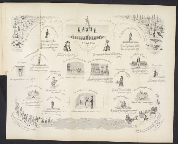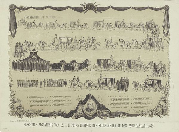 This print captures the funeral procession of the Queen of the Netherlands on June 20th, 1877, and was created by an anonymous artist. This detailed depiction of a royal funeral is more than just a record; it's a window into the rituals of power, gender, and national identity in the late 19th century. Consider the role of women, even in death, within the monarchy and society. The Queen, as a symbol of motherhood and nationhood, was central to the image of the Dutch state. Her funeral, meticulously documented here, served as a carefully orchestrated performance of grief and reverence, reinforcing social hierarchies. The elaborate display of military personnel, horse-drawn carriages, and dignitaries, all marching in precise order, underscore the power and reach of the monarchy. The artist provides a snapshot of a society grappling with questions of tradition and modernity, offering us a glimpse into the emotional and political landscape of the Netherlands.
