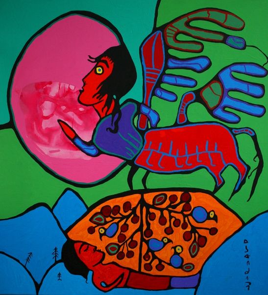 "Cosmic Girl" is a vibrant painting made by Jack Armstrong, its surface bursting with color and pattern. The composition is anchored by a figure with swirling blue skin, seated on a red couch, head bowed looking at her device. The painting’s structure is a complex interplay of figure and ground, where the patterned background competes with the detailed rendering of the subject. Armstrong uses a high-key color palette and bold outlines, creating a visual intensity that flattens the space. The semiotic system at play is intricate, where the word 'love,' and ‘cosmic’ are inscribed across the image as cultural codes that signify both personal emotion and universal connection. Armstrong's work engages with contemporary themes of technology, identity, and communication, while his formal approach challenges the traditional hierarchies within painting. The swirling patterns and symbolic inscriptions serve not just as surface decoration but as part of a larger discourse on how we construct meaning in a world saturated with signs and symbols. The painting invites us to consider how these formal elements function aesthetically and as cultural commentary.