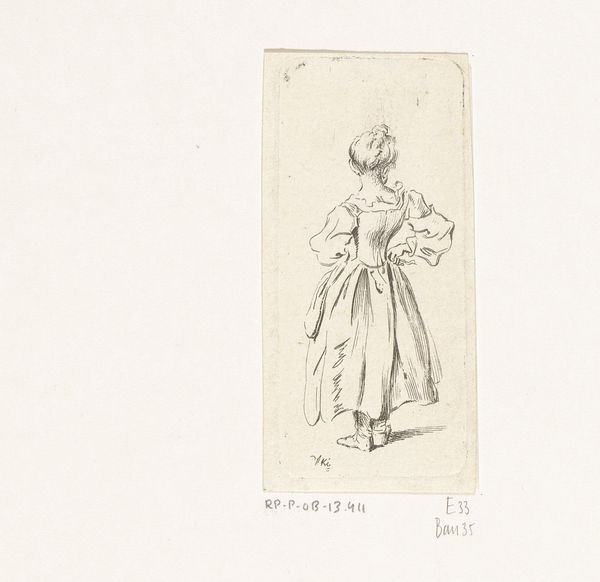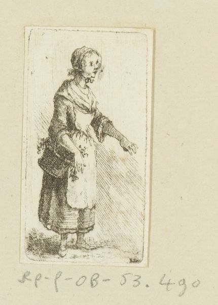 Curator: Immediately, there's a starkness. The linework is quite economical, but it gives such volume to the figure. Editor: Precisely! Ernst Willem Jan Bagelaar created this ink drawing on paper, "Standing Farmer Woman," sometime between 1785 and 1837. It embodies a particular fascination with representing everyday rural life. The narrative emerges primarily through a focus on the woman herself. Curator: Agreed, it's the directness of the depiction that strikes me. Look how the washes define her form, creating a sense of depth and weight. The minimal shading around her feet grounds her so effectively, doesn’t it? Editor: It certainly gives her a presence. These so-called genre scenes became incredibly popular. What is she thinking, feeling, her experience as a member of a hard working class? Artists found an eager audience among a bourgeoisie that was increasingly sentimental and enjoyed these picturesque rural depictions, particularly farmers. This also romanticized her position in a way. Curator: An intriguing point. Yet, on close inspection, the drawing has so much compositional rhythm, achieved so economically by varying the weight of the line and the areas of shading. There is this dance in how the robe falls from the right and her head gear on the left and how those echo downward into the contour of the calf. Editor: Absolutely, it's like Bagelaar is dissecting this figure into its essentials. There is something unidealized and dignified here at the same time. By foregoing flourishes in her attire and not flattering, the drawing really captures some type of experience, real or constructed. It raises interesting questions. Curator: A beautiful reminder that even a simple sketch can hold multiple layers of meaning and invite various viewpoints, be them social, historical, or purely aesthetic. Editor: Indeed. It urges us to remember the complexities inherent in even seemingly simple representations and reminds us of the power dynamics at play during that time in the Dutch Republic.