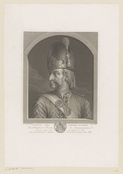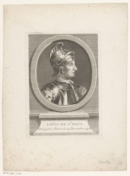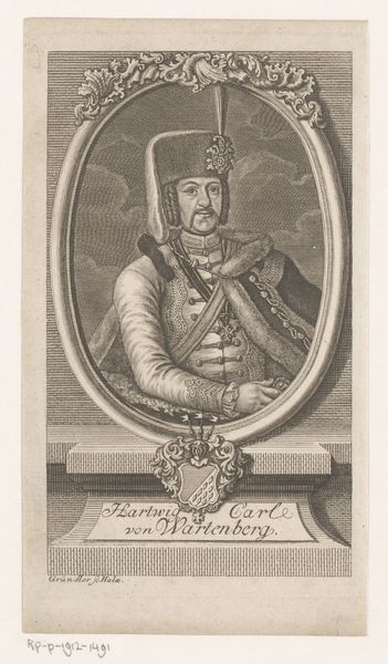 Curator: Immediately, what strikes me is the starkness of the engraving; the stark black and white. It's so formal, classical almost. Editor: Well, let's set the stage. This is a print, titled "Portret van Hendrik III", by Jean Pelletier. It dates to between 1755 and 1765. A fascinating time for printmaking, situated firmly in the age of expanding printing capabilities, democratizing image production beyond the elite. Curator: I find the composition quite arresting. The subject is encased in an oval which rests on what looks like an embellished pedestal, it calls for rigid framing! It accentuates the imposing air the artist is clearly after, don't you think? Editor: Certainly, there’s an element of grandeur intended in that oval and pedestal, but the very material betrays its historical context. Engravings were often used for reproductions and illustrations in books and pamphlets. It speaks volumes about the culture's means of distributing and engaging with images of power and the history of art through print. Curator: True, the image of power is indeed a cultural construct of production means and class awareness... still the fineness of lines! They have an evocative effect, the meticulous craft is what makes me engage so immediately with the king, particularly the details in his crown and the patterned folds of his robe. Editor: Consider the economic aspect! Printmaking demanded skilled labor, and it represents an intersection of art, commerce, and social dissemination. This portrait becomes accessible and multiplies its socio-cultural weight and even its power in ways exclusive painting wouldn’t be. Curator: I hadn't considered how accessible this image of nobility becomes because of printmaking techniques. Editor: Exactly. And accessibility affects interpretation. How might contemporary viewers perceive it in different social classes of viewers, given this proliferation? It makes me reconsider it. Curator: Ultimately, Pelletier’s skill lies in evoking presence and a powerful one indeed. I came to admire the baroque texture achieved in such minimal medium as well, and it's something only visual and theoretical inspection can reach. Editor: And ultimately, situating an engraving in its context allows one to investigate the circulation and consumption of the medium itself as an item with history and labor.