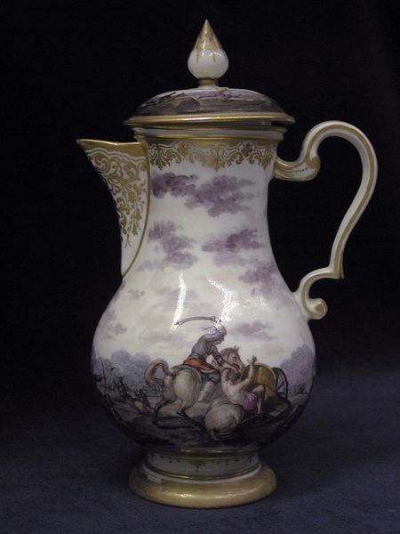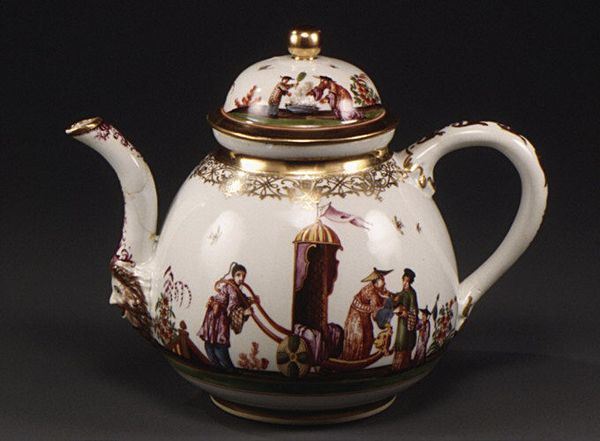 Editor: We’re looking at a porcelain teapot, part of a service, made by Meissen Manufactory between 1720 and 1725. The crisp black silhouettes against the white porcelain give it a striking, almost playful quality. What catches your eye in terms of its construction? Curator: The stark contrast between the black enamel and the white porcelain is indeed visually arresting, and serves to accentuate the forms rendered. Observe how the artist utilized the curvature of the teapot to influence the placement and perspective of these figures, these plants, even the birds. The frieze of human figures and fantastic fauna encircling the pot, they are not merely decorative elements; their shapes contribute to the teapot's overall structural harmony. It has a nearly self-contained universe look about it. Editor: I see what you mean. It’s not just applied decoration, it is integral. I guess what seemed whimsical at first glance has a stricter, almost mathematical quality about it. Do you think that the handle or the spout function as structural elements? Curator: Precisely. The spout and handle, while functional, serve as framing devices. They arrest the eye, creating a visual pause. Without them, the dynamic figures might seem to float aimlessly around the ceramic body. Furthermore, the near-absence of color concentrates the viewer's attention on the line, balance and shape. Does this then give rise to certain feeling? Editor: It’s really interesting how each component supports the overall design. Now I think the color adds an expressive element to this. It moves between drama and light. Thanks for pointing that out. Curator: Indeed. Reflect on this convergence of artistry and manufacture – a vessel of utility transformed into a tableau of pure visual delight.