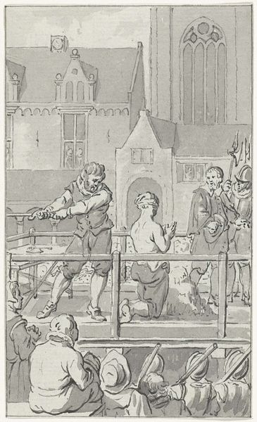 This print, made by Theodoor Koning, depicts the beheading of Cornelis de Hooghe in the Netherlands in 1583. It is an image of public punishment, common in early modern Europe, capturing a moment laden with political and social meaning. The print illustrates more than just the act of execution. The setting—the 'Hof van Holland' or Court of Holland— situates the event within a system of justice and governance. Executions were public spectacles, serving as potent reminders of state power. Consider how the crowd's presence underscores the communal nature of justice in this period, with social order maintained through these events. Visual codes like the executioner's clothing, the placement of the kneeling figure, and the onlookers convey cultural attitudes towards crime, punishment, and authority. We can use such historical images to investigate the relationship between the state and its citizens. Through archival research, legal documents, and other primary source materials, we can better understand the intricate relationship between art and its social and institutional context.