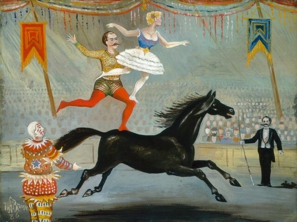 Laura Knight painted “The Trick Act” using oil paint on canvas. The nature of oil allows for a rich texture and depth, visible in the way she has layered the pigments. Knight was fascinated by the circus, and spent a great deal of time within that world. The circus represents a certain kind of labor – highly skilled, and physically demanding. The apparent effortlessness of the performance belies the many hours of practice. And in this painting, Knight seems to be celebrating that aspect of the circus. She takes as her subject matter the performers, but also focuses on the behind-the-scenes activity required to keep the circus going. The oil paint medium emphasizes the artist’s own ‘performance’, too, her skill in capturing the fleeting movements of the circus, almost like a snapshot. Thinking about materials, making, and context encourages us to question the traditional hierarchy between fine art and more applied practices.