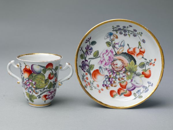 Curator: Looking at this Doccia porcelain cup and saucer from around 1745 to 1760, it’s impossible not to think about the rise of courtly culture and aristocratic rituals surrounding beverages like tea and coffee during this period. Editor: It strikes me immediately as dainty, almost frivolously so. The light yellow, the gold filigree... it's clearly designed for leisurely consumption, perhaps amidst polite conversation. Curator: Exactly. These objects became important markers of status and identity. The imagery on the cup and saucer— cherubic figures and floral arrangements—weren't merely decorative. They were deeply symbolic, evoking notions of innocence, natural bounty, and even subtle eroticism, all incredibly charged themes during the Rococo period. Think about the political implications of consuming luxury goods made for exclusive communities in Europe. Editor: The arrangement on the saucer into cross-sectional vignettes also creates this beautiful tension between structure and freedom; it’s ornamental yet rigorously contained. The gold latticework emphasizes division, yet the flowing Rococo design suggests continuity. Curator: And consider the labour behind these objects, often obscured in discussions of the elite. Porcelain production involved complex networks of trade, extraction of materials, and artisanal craftsmanship, with considerable global impact. How many hands, from so many diverse backgrounds, do you suppose shaped each piece? It pushes us to consider not only who consumed from these pieces, but who manufactured them and what material was used to produce it. Editor: Absolutely. Looking at this piece now, I notice the juxtaposition of what seems playful on the surface with the heavier aspects beneath; class, colonialism, global impact. The delicate ornamentation conceals the complex economic and political underpinnings of its existence. Curator: Indeed. It becomes clear that the study of decorative arts allows us to decode visual forms to understand hidden politics and social structures. Editor: Precisely, analyzing such visual languages helps unpack how luxury objects reflect—and sometimes perpetuate—specific power structures and inequalities in society.