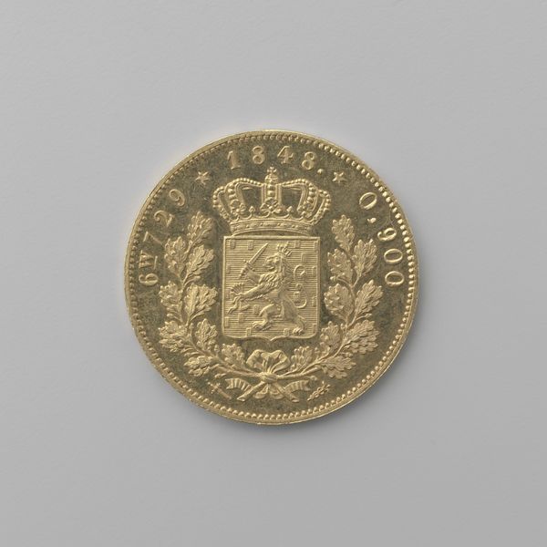 This is a Dutch 10 Gulden coin from 1842, designed by King Willem II. It’s crafted from gold, and its circular shape and radiating text immediately convey order and authority. The warm, golden hue speaks to its inherent monetary value. The composition is structured around a central heraldic shield, topped with a crown, emblazoned with a lion holding a sword and arrows. This lion is a potent symbol, rooted in heraldic tradition, representing the power and sovereignty of the Dutch monarchy. The choice of these elements is not accidental; they serve as visual anchors that reinforce ideas of national identity and royal authority. The coin’s inscriptions, arranged in a continuous circle, frame the central image and underscore the coin's official status. Consider how this design, beyond its economic function, visually communicates the kingdom's values and aspirations. The coin is not just a tool for trade, but a symbol of Dutch identity.
