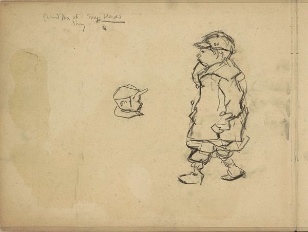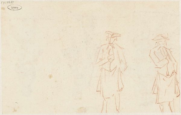 Curator: This drawing, “Studie van een man in zeventiende-eeuwse kleding” or “Study of a man in seventeenth-century clothing” by Johannes Bosboom, dates sometime between 1827 and 1891. It is done in pencil and housed at the Rijksmuseum. I'm immediately struck by how spare the rendering is – almost ghostly. Editor: It's a very light sketch, isn’t it? What do you see in the composition itself that draws your eye? Curator: The drawing hinges on the contrast between implied form and absent detail. Note the almost hesitant lines; they delicately suggest the shape of the man’s cloak and hat without ever fully committing to a definite contour. It’s a study in potential rather than resolution. Consider the tonal values as well. Bosboom masterfully uses the aged paper's color to amplify the sparse pencil work, giving the piece an ethereal quality. It makes me curious if the goal of the drawing was for the process itself, to only fix on the paper an idea that's being tested. Editor: So the deliberate choice to leave it unfinished enhances its expressive quality? It allows for a reading of transience and elusiveness? Curator: Precisely. If the lines were cleaner, or there was added shading, the work might appear conventional and fixed. The visual language communicates ephemerality. Note that its beauty comes specifically from its formal incompleteness, because it embraces impermanence and suggestion rather than rigid definition. Editor: I never thought about incompleteness as being so effective. It feels like it captures an instant, a fleeting moment. Thank you. Curator: The pleasure lies in discerning how seemingly simple marks can suggest complex forms. Looking closer truly transforms perception.