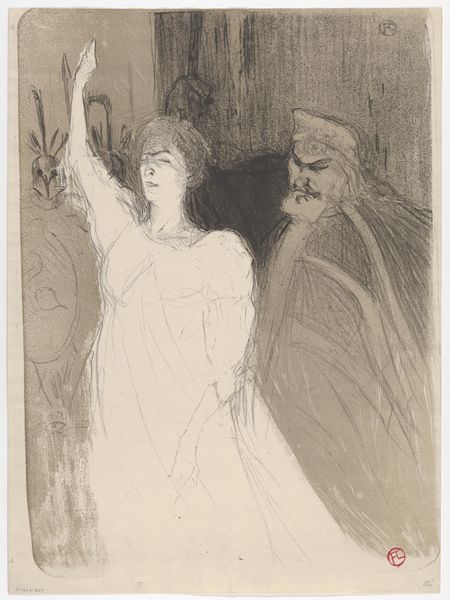 Editor: Here we have Toulouse-Lautrec's 1893 lithograph, "Folies-Bergere: The Censors of M. Prudhomme." It's intriguing; it feels like a snapshot, capturing a moment of slightly chaotic revelry with that lone figure seemingly overwhelmed. What do you make of it? Curator: The piece pulses with the energy of fin-de-siècle Paris. Consider the implied narrative: the title itself invites us to contemplate hypocrisy and the gaze. M. Prudhomme, a stock character representing the bourgeois, is seemingly caught in the intoxicating world of the Folies-Bergere. How do you interpret the stark contrast between Prudhomme and the dancers? Editor: Well, the dancers appear fluid and almost abstract, especially the black silhouette, while Prudhomme seems rigid and discomforted. He almost looks like he's being engulfed by the scene. Is that contrast intentional on Lautrec's part? Curator: Absolutely. Lautrec was a master of social commentary, embedding these contrasts to expose the complexities of Parisian society. He uses Prudhomme, surrounded by movement and sensuality, as a symbol. What might he be a symbol *of*, though? Perhaps of repression confronting liberation? Note how he's positioned—literally in the lower corner, almost pressed into the floor, seemingly about to be overrun, even as the stoic sculpture remains in the upper-left? Editor: That makes a lot of sense! It highlights how the emerging freedoms challenged established norms. I initially just saw a party scene, but there's so much more to it. Curator: Indeed. The symbols – Prudhomme, the dancers, even the architectural space itself – contribute to a potent commentary on a society in transition, and perhaps its own hidden desires, longings that threaten to disrupt and destabilize the veneer of order. These potent and contrasting images continue to shape how we remember and understand Parisian society during this period. Editor: Thanks. That deeper understanding really adds another layer to my appreciation of the print. Curator: My pleasure. Remember that images, like words, have layers of meaning shaped by culture, time, and our own interpretations.