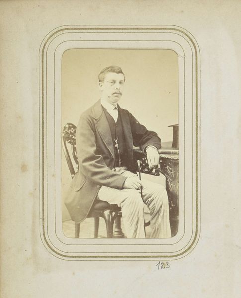 Curator: Immediately striking, isn't it? The subject's gaze is unnerving, almost a challenge. Editor: This gelatin-silver print, titled "Robert Stevenson," was taken around 1865 by Reed Brockway Bontecou. Bontecou was known for his medical photography during the Civil War, which undoubtedly informs this image. It’s currently held at the Metropolitan Museum of Art. Curator: The focus here isn't heroism; it’s brutal realism. Look at the directness in his eyes. And the wound, visible on his leg... There’s a frankness that diverges sharply from the idealized portrayals of soldiers we often see. Editor: Indeed. War photographs like these presented a radical departure from earlier historical painting traditions which frequently idealized conflict and its participants. Bontecou’s photograph seems almost anthropological. Curator: Precisely! The wound acts as a sort of symbol itself. His bare thigh, that vulnerability... It speaks to the costs of conflict etched not in glory but directly into the body. Editor: There's also a psychological component, wouldn't you agree? The lack of theatrics invites us to meditate on Stevenson’s internal experience, his resilience, but perhaps also the trauma. Note, also, the man's stoicism; perhaps an ideal which war culture encourages in its participants. Curator: Absolutely. It’s as if the very process of being photographed contributes to that psychological weight. To be so scrutinized, even captured forever in a single moment, amplifies the intensity. The man’s expression feels so burdened. It underscores the idea that beyond military or political agendas, war is ultimately personal. Editor: Bontecou gave us not just a historical artifact, but a study of suffering and strength rendered unforgettable through early photographic processes. Curator: Looking at this portrait, I am once again reminded of art's power in bearing witness. Editor: I am left to reflect on what is said and what will remain unseen, what symbols and secrets are layered here in our collective memories.