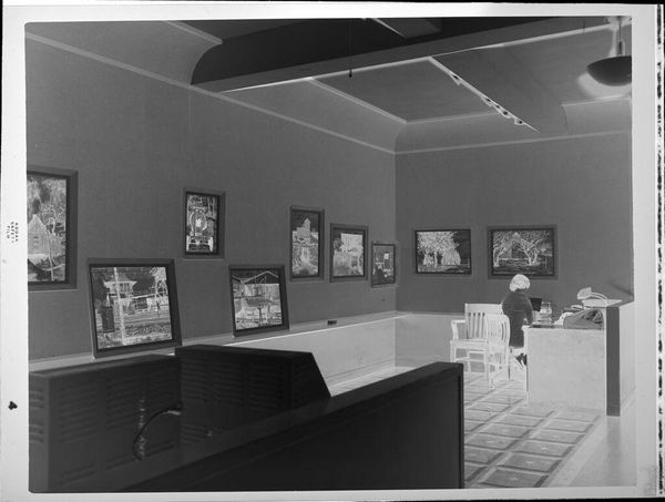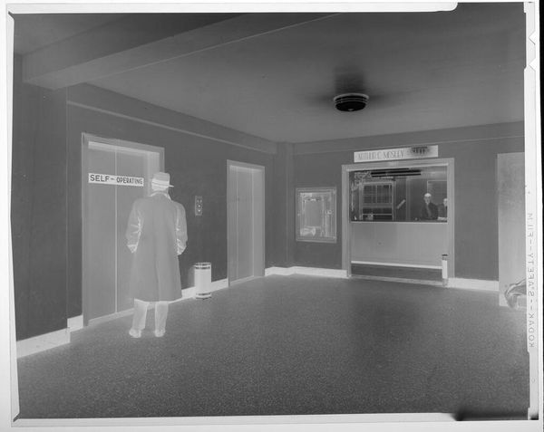 Curator: This image, "Untitled (man walking into elevator in Police Department)" by Jack Gould, presents us with a stark, monochromatic scene. The silver gelatin print shows a man entering an elevator inside a police station. It's a rather unsettling image, wouldn't you agree? Editor: Absolutely, the starkness amplifies the inherent power dynamics. You've got the architecture of control – the police department – literally framing the figure entering the elevator, disappearing further into the system. Who is this man? Is he a suspect, a witness, or something else entirely? Curator: Exactly. The composition, the materials, they all underscore a sense of institutional coldness. The elevator becomes a metaphor for the machinery of justice, an entry point into a system of regulation and potential confinement. Editor: And consider the social context. Police stations, particularly during the era this photograph likely originates from, were often sites of intense racial and social inequality. This image hints at the often invisible processes of law enforcement, the power structures at play behind closed doors. The labor of maintaining order... Curator: Indeed, it also questions the labor of photography itself in shaping perceptions. Gould's choice of perspective and printing process is crucial. Editor: It forces us to confront the uneasy relationship between image, power, and justice. Curator: A very fitting end to this discussion. Editor: Indeed, a potent reflection.