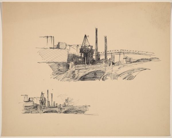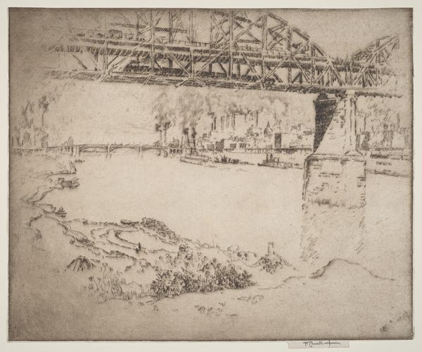 Curator: Right now, we’re looking at Joseph Pennell’s “Cranes, Bessemer,” an etching he created in 1909. It's currently held in the collection of the Art Institute of Chicago. Editor: It hits you immediately, doesn’t it? This industrial dreamscape, all smokestacks and skeletal cranes reaching up. There's something delicate in the lines, almost as if this brutal, manufactured world is breathing. It’s less a celebration, and more a kind of awed observation, you know? Curator: Pennell, a staunch modernist, was quite fascinated by industrial scenes. It really ties into that era’s complicated dance with modernity: the simultaneous excitement and apprehension around progress. What might be less evident initially, I suppose, is how this work situates the artist in relation to prevailing themes of urbanisation and labor rights debates. Editor: That’s a clever connection. So, he’s not just recording what he sees, he’s implicitly taking sides? He really captures a raw, chaotic kind of beauty, as unsettling as it is compelling. Those haphazard lines—they give it a vibrancy that a more polished, composed depiction would lack. And all those crisscrossing girders... Makes me almost claustrophobic! Curator: Yes! The crisscrossing lines certainly lend to the feeling of complex and maybe dangerous networks of power. Art critics have historically talked about how artists like Pennell approached industrial settings to evoke awe, like a new sublime. The etching method suited his style because it mirrors the industrial grit that the city exudes. Editor: Hmm, the sublime... I see it, though. I'm still fixated on how he's able to suggest the sheer scale of this industrial site without overwhelming the viewer. The smokestacks fade into the background haze, really drawing you in! It doesn't glorify industry as much as meditate on its looming, unavoidable presence. Curator: That's right. Through this medium, the artist could make commentary about American industrial expansion at the turn of the century. There's so much to interpret within this artwork about socio-historical realities. Editor: Looking at it again, this makes you really pause about human endeavor. Beautiful, and brutal all in one sweep. I'm seeing things in an entirely different light, and so appreciate you opening up so many contextual frameworks to explore them. Curator: It's my pleasure. And that is where the charm of art lies, isn’t it? Forever offering something new.