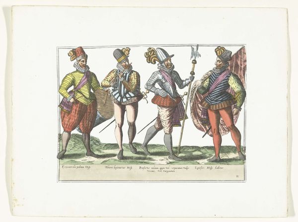 Editor: This print, dating from 1872-1875, is titled *Drie Spaanse militairen in uniform en een marketentster, ca. 1580*. It's attributed to an anonymous artist. I am really intrigued by their attire – it seems almost theatrical, or perhaps excessively ornate, for soldiers! What strikes you about this work? Curator: The figures stand stiffly, each with particular props. See how their poses are almost identical? In my reading, their garments work like a symbolic language. Their individual clothing and the accoutrements identify their roles, visually encoding a hierarchy and order. It represents much more than mere military fashion. Editor: Could you elaborate on that idea of symbolic language in dress? Curator: Consider how the fabrics, colors, and ornamentation function as social markers. For example, the elaborate detailing – plumes, slashing, and the cut of each piece—assert their elevated status. Each element proclaims authority and reinforces collective identity and allegiance. Their sartorial choices offer psychological insight: carefully cultivated displays of self, constructed to intimidate or inspire loyalty. Do you notice a similar language operating in contemporary fashion? Editor: That’s fascinating! I guess I hadn't considered clothing as such a potent form of communication, or how consistently this visual language has existed across time. It really sheds new light on what I had previously considered “fashion." Curator: Exactly! Prints like this remind us that clothing has consistently functioned as a complex system of signs, laden with psychological, cultural, and historical weight. Looking at the clothes, we can glimpse entire worldviews. Editor: This definitely shifts how I view both historical artwork and people today; everything they choose to wear reflects something about their place and ideas. Thanks so much.