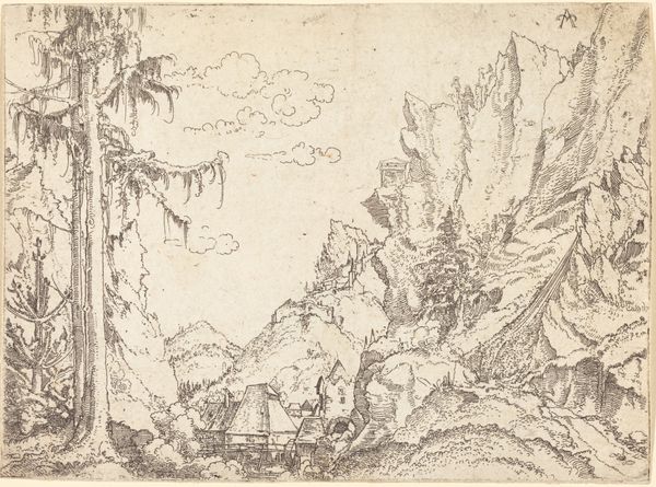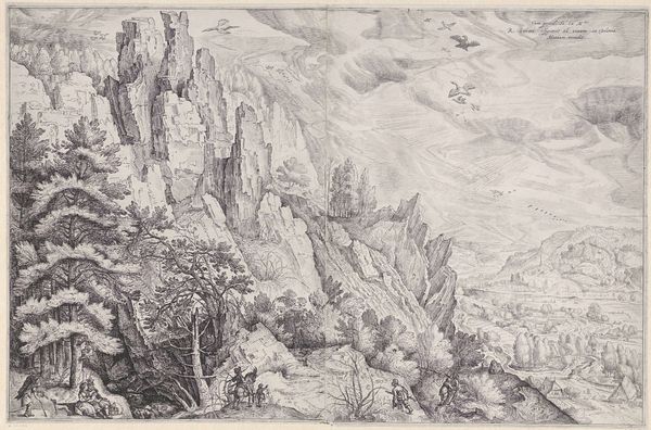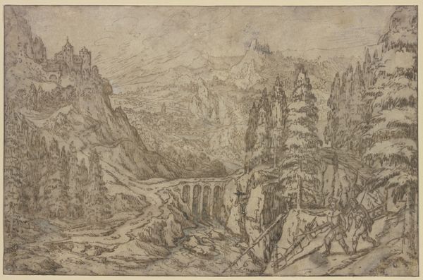 Curator: Here we have Jacob Savery I’s “Panoramic River Landscape,” an etching believed to have been created around 1590. It exemplifies Northern Renaissance interest in detail, line, and form. What are your initial impressions? Editor: The color immediately pulls me in—that warm, sepia tone! It feels almost like a faded memory, a landscape preserved in amber. There's something inherently nostalgic and romantic about the scene. Curator: Absolutely. Etchings like this, during that era, served to catalogue the known world but also infused it with imaginative details. Note the cityscapes nestled within this meticulously rendered river valley. Editor: I'm drawn to the way Savery has built up such a rich tapestry of textures with what must be an incredibly fine line. Look at the mountains and foliage – there’s such movement within what seems to be a calm, stable image. Curator: The cities represent order and human aspiration, framed by the wilderness and promise of nature. There's tension in that balance, don’t you think? A sort of… humility versus grandeur. Editor: Precisely! And maybe even a touch of foreboding? Those towering mountains certainly make humanity feel… diminutive. But look at the light glinting off that river; maybe it's the river, the flowing possibility, that truly anchors the composition. Curator: Yes, and water often symbolizes transformation or even cleansing, in this case perhaps feeding a prosperous settlement. These visual elements are never by accident. Editor: This landscape is a fantastic, believable vision, like something you’d imagine encountering only in a particularly vivid dream, so precise and orderly but so… big. It seems less about faithful depiction and more about emotional experience. Curator: That’s insightful. Savery uses a detailed etching to create an emotive space. Considering how relatively small the original is, it makes the artwork feel much more epic. Editor: Definitely. I feel smaller just contemplating its details, like some miniature Gulliver standing at the edge of an incredible landscape. What a marvelous sense of place! Curator: It truly offers us a captivating journey back in time—visually and symbolically. Editor: It really makes one appreciate both the power of art and our ever-changing interpretations across time.
