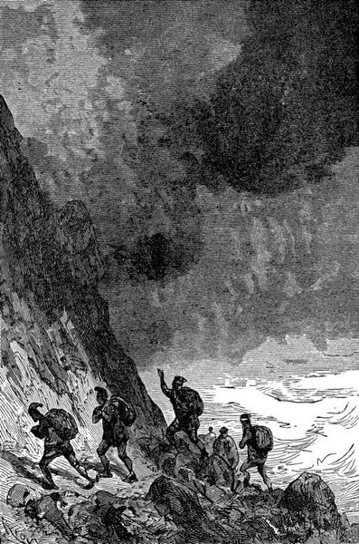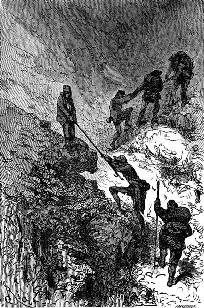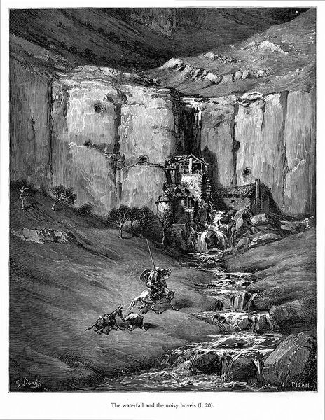 Editor: So, here we have a Gustave Doré engraving of, apparently, Don Quixote. It looks incredibly dramatic; this whole landscape is brimming with people and horses struggling to cross this tiny bridge. What jumps out at you? Curator: Jumps? Precisely! Doré really throws us into the thick of it, doesn't he? This image has always felt to me less about the particular story of Don Quixote and more a broader meditation on the nature of heroism, the absurd grandeur of conflict, perhaps even a darkly comic reflection on human folly. Can you feel the weight of the history-painting tradition he’s grappling with? He’s got figures teetering all over the place. There is an inherent danger when we commit to something – and sometimes we should simply acknowledge our fear and doubt, like a modern Sancho Panza might say: ‘Is it worth it?!' Editor: The risk of everything falling apart certainly is part of it! This really does prompt reflection on commitment, especially if success or failure is not guaranteed, but failure is still meaningful, a notion deeply present in *Don Quixote*. And that engraving is incredible. The chaos of line and composition feels deliberately… overwhelming. Curator: Absolutely! The overwhelming-ness *is* the point. Look how Doré uses light and shadow, that churning waterfall against the jagged rocks, that impossibly narrow bridge against the mountainous background. All point to a vision, if you’re open to receiving one, that grand ideals meet harsh reality, leaving everyone a bit soaked and battered in the process. He offers an almost tangible glimpse of the chaotic consequences that lie between idea and manifestation. Isn’t that just life? Editor: It really is, and Doré makes that sentiment vivid. Thanks. I won’t look at a bridge the same way ever again. Curator: Nor I… Pass the metaphorical towel, would you?