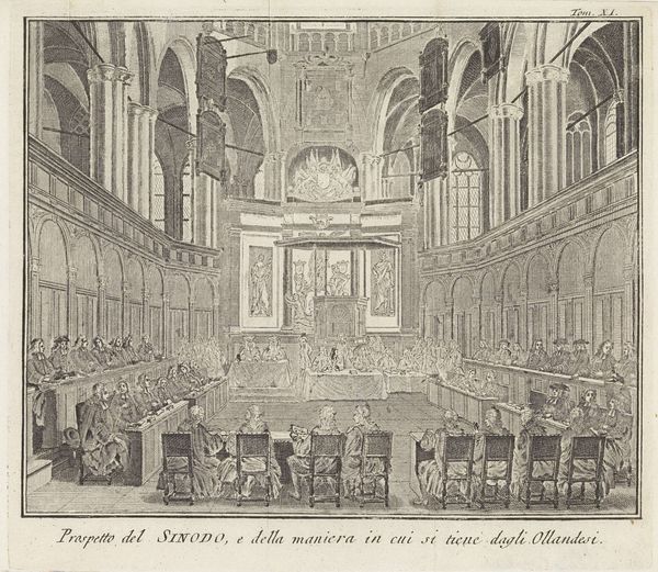 Curator: The piece before us, rendered meticulously by Nicolaas van Frankendaal in 1774, is entitled "Interieur van de schouwburg te Amsterdam," which translates to "Interior of the Theater in Amsterdam." It’s an engraving currently held in the Rijksmuseum. Editor: It's stunning. The sheer density of the crowd, packed into this grand hall, is what immediately jumps out. And that receding perspective really gives you a sense of the theater's depth and volume, the tiers upon tiers… almost overwhelming. Curator: The depiction offers a window into the cultural life of Amsterdam during the Dutch Golden Age, capturing the ambiance of theatrical entertainment. The presence of a genre painting style is quite evident as well. Notice how the engraving medium allows for incredibly detailed rendering of the audience and the architectural elements. Editor: Definitely, but who had access to such spaces? Looking closely, it feels almost entirely composed of what we might assume were elite members of society. What kinds of performances did this social structure promote or even limit, consciously or unconsciously? It reflects the stark class divisions of the time, I think. Curator: Precisely. Public spaces like theaters have always been sites of social negotiation and power. In this piece, the gaze is directed both ways. The audience observes the play, but the artist, and by extension, we as viewers, are also observing the audience. How does the representation itself contribute to or challenge prevailing social norms? The choice of a panoramic perspective reinforces the impression of the theater as a contained microcosm of Amsterdam society. Editor: Thinking about the architecture and how it positions bodies reminds me how power is staged spatially too, not just on stage. These gilded boxes reinforce hierarchical social arrangements. Curator: An artwork like this urges us to look beyond just aesthetic appreciation. It enables us to contemplate on social norms and politics around spaces for art as they shift over centuries. Editor: Agreed, seeing it today prompts reflection on how far we’ve come in making cultural spaces accessible, and reminds us of how much further we must go in creating equitable and truly inclusive environments.