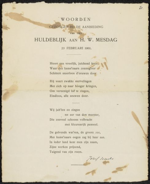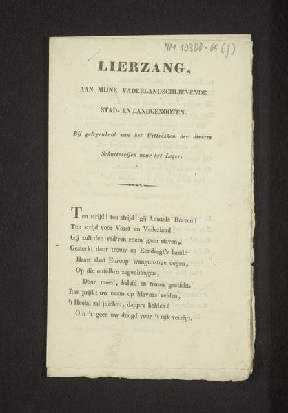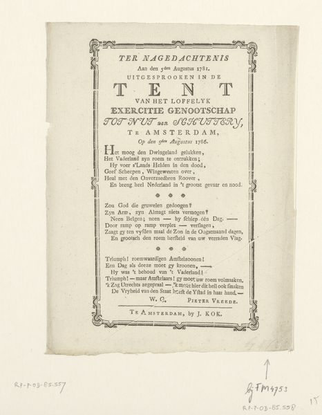 Marten Westerman created "De Nederlandsche Vlag," or "The Dutch Flag" in English, using the printed word on paper. Though humble materials, the processes of printing and publishing imbue the artwork with social and cultural significance, and the Dutch text speaks volumes. The choice of printing—a relatively modern and efficient method of production—allowed Westerman to disseminate his poem widely, engaging with the politics of his time. The neat, orderly lines of text contrast with the revolutionary fervor of the poem itself, hinting at the tension between tradition and change that characterized the Netherlands. Look closely, and you can see the texture and weight of the paper, a reminder of the physical labor involved in producing and distributing this printed matter. This piece is not just a poem; it's a product of its time, reflecting the complex interplay between art, industry, and social change. By focusing on materials, making, and context, we gain a deeper appreciation for the full meaning of Westerman's work, challenging traditional distinctions between fine art and craft.