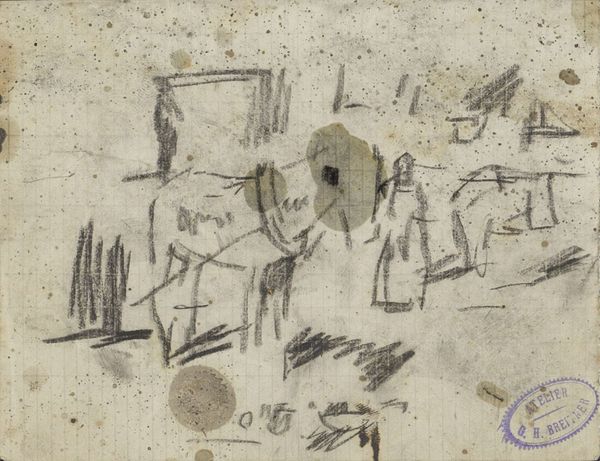 Curator: This drawing is entitled *Landschap met drie ruiters, mogelijk huzaren*, which translates to *Landscape with Three Riders, Possibly Hussars*, created by George Hendrik Breitner likely between 1882 and 1912. The medium is pencil on paper. Editor: My first impression is that it looks like the artist just woke up, grabbed the nearest pencil, and captured the fading dream, those horsemen like dissolving phantoms. There’s an immediacy here, a real rawness, wouldn’t you agree? Curator: I do. Breitner had a distinct inclination towards capturing fleeting moments in urban and military life. This drawing exemplifies his impressionistic style and captures not just a landscape but potentially aspects of military masculinity and its intersection with the Dutch landscape. Hussars, known for their flamboyant uniforms and daring attitude, often embodied specific ideals around militarized Dutch identity in the late 19th century. Editor: Flamboyant uniforms, well, you have to imagine them really, given the minimal lines! But it's true; the sketchy quality only amplifies that sense of impermanence. The almost frantic strokes suggest speed, movement, maybe even anxiety? I sense tension in the composition; it looks less like a celebration of military might, and more of its uneasy co-existence with stillness. Curator: Indeed, one could even read into the unfinished nature of the sketch as indicative of the shifting sands of military power and the fleeting nature of imperial projection in the Netherlands. Consider the socio-political climate: there were tensions arising from colonialism, debates around national identity… Breitner was undoubtedly aware. Editor: Okay, but to me, it just feels unfinished. Like the artist ran out of time or got bored. Sometimes art is just…art. A quick impression dashed off. And the fact it's on paper, lends to that intimacy. Curator: But consider that choice of medium can also represent something far beyond the practical. The swift strokes of the pencil give rise to notions around class as well. While the painting could have represented valor and success, the sketch hints to perhaps the everyman's struggle. Editor: I get your reading. Art as social commentary, always valuable to remember. All these perspectives allow the modern observer to rethink a lot. For me, it brings us back to our initial sense, the haunting power of an artist rendering a fragment of memory onto paper. Curator: Precisely, prompting us to reconsider history not as fixed narrative, but rather through suggestive sketches.
