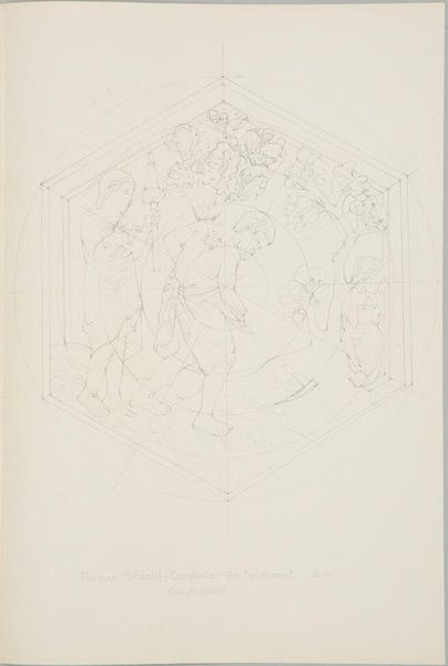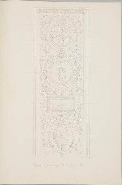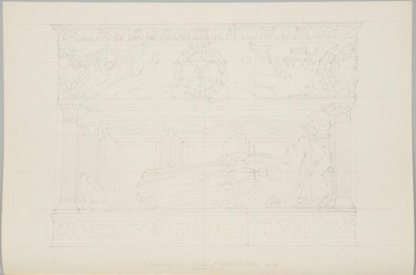 Curator: It strikes me how linear and precise this sketch is. Editor: Indeed. We're looking at Kenneth John Conant's rendering of the Tomb of Cardinal Francesco Uguccioni Brandi d'Urbino, located in Rome's S. Francesca Romana. Conant’s image captures the monument's design with remarkable clarity. Curator: The Cardinal's representation, flanked by supporting figures, feels very much like a statement of power, doesn't it? Who held it, and who was allowed to perform it? Editor: Absolutely. And the use of line, in particular, creates a stark and powerful image. The tomb's iconography, a key part of that power, uses religious symbolism to tell a story of not only his life but his contributions to the church. Curator: Seeing this image now reminds me of how visual representations have historically reinforced societal structures. This single tomb becomes a case study of religious power. Editor: Precisely. Examining the formal elements and the context allows for a multi-layered experience, doesn't it?
