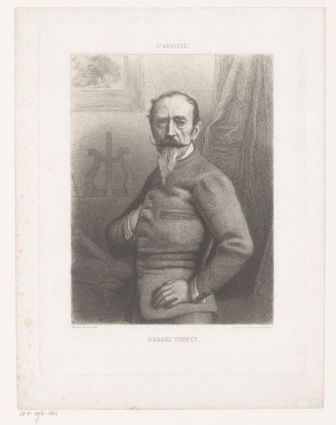 Curator: Welcome. Here we have Horace Vernet's "Self-Portrait with Pipe," completed in 1835. It's an oil painting, currently housed in the Hermitage Museum in Saint Petersburg. What strikes you initially about this piece? Editor: The arrangement of forms immediately suggests an almost casual sophistication. The off-center positioning of the figure, the stark contrast between the dark coat and bright trousers, it all coalesces to create a balanced yet dynamic visual field. Curator: It is interesting how Vernet presents himself. The attire, the pipe... consider the social implications. He presents himself not just as a painter, but a certain kind of painter. Romantic, perhaps, even bohemian. This wasn’t just about painting pictures; it was about crafting an identity, advertising his studio and, of course, labor and the materials he consumes to create. Editor: Precisely. But let's also note the subtle but powerful diagonal lines established by the pipe and his leaning posture, converging at the face, leading our eye directly to the artist’s gaze. It's masterful control of composition. Even that slightly unfinished canvas propped against the wall is intentional to the Romantic sentiment; it provides an atmosphere and backdrop that isn’t about the high society and aristocracy so prevelent in society. Curator: And how does the setting of what appears to be the artist's studio play into this image of romantic artistry? The placement of the painting utensils seems almost too performative. Every item is a marker of his trade; brushes and tubes scattered, perhaps haphazardly, on a nearby chair next to his rug, but strategically within view and is another type of production by his own making. Editor: Perhaps so, yet I read it also as carefully chosen in the construction of this intimate depiction of his studio life. Note the colors, too—how the earthy tones of the background and the stove contrast and harmonize with the whites of his clothes and the brighter reds of his belt and rug and draws the attention toward the seated man’s silhouette. Curator: So, while on the surface, we're presented with this image of a carefree artist in his studio, puffing his pipe... what’s underneath is this intersection of self-representation and a commentary of an era and emerging artistic expectations. Editor: Ultimately, I come away with a deeper appreciation for how Vernet leverages his composition and visual language to speak of a larger-than-life character. Curator: I agree. It has left me with a sense of not just Vernet, but also with all artists' struggle of selling both the art and the lifestyle together in tandem.
