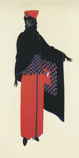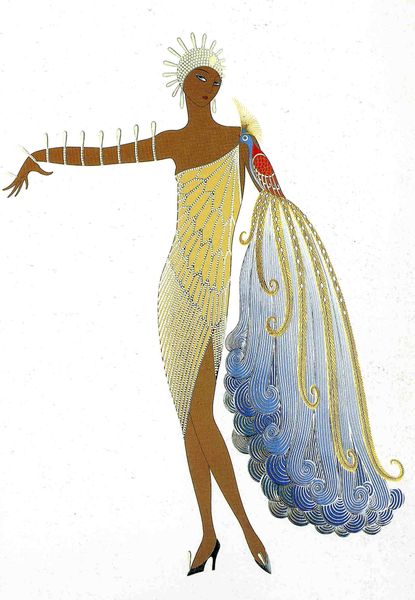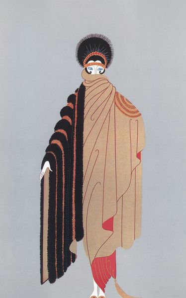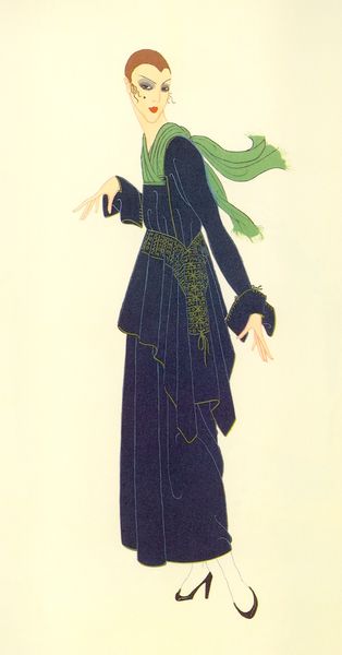 Curator: This piece is called "Directoire" by Erté. Erté, of course, being the pseudonym for Romain de Tirtoff, a Russian-born French artist and designer, primarily known for his elegant fashion illustrations that captured the Art Deco spirit. We believe this artwork was composed with acrylic paints. Editor: Oh, my goodness, she looks like she's floating! It's that ethereal quality, almost as if she's a beautifully designed kite, drifting along on a pastel breeze. There’s something undeniably chic but slightly mournful about her stance too. Curator: The figure's pose and costume design definitely evoke a certain historical moment, nodding towards the Directoire period following the French Revolution. Her garments, especially that column dress, symbolize an aesthetic shift and a return to classical antiquity that followed a turbulent period. This wasn't merely about clothing; it mirrored broader societal changes and philosophical viewpoints that valued simplicity and order. Editor: Yes, the simplicity! It’s all elegant restraint, isn't it? You've got these controlled curves, the almost mathematically precise details but then, the way that turquoise scarf things swirls! That teal gives it this…underwater feeling somehow. It’s very calming. Curator: Absolutely. Considering Erté’s work within a wider historical context is revealing. Fashion illustration was certainly not just about showcasing clothes. It performed a significant cultural function in representing shifting ideals of beauty, gender roles, and societal aspirations. The decorative-art qualities evident in his creations made his visions really accessible across different segments of society. Editor: The overall effect gives a great visual treat, really! The flat application of colour makes it crisp, clean and a little bit playful despite the subject’s sombre poise. The contrast with the opulent Art Deco style it later embraced is significant. I love this tension, like she's trying to decide between different eras, poised on the edge of something new. Curator: Indeed, I appreciate the multiple layers present here: between its surface appearance and its deeper reflection on history. The decorative art style provides a window into complex themes regarding gender and modernity during a period marked by change. Editor: To be able to reflect, and design through it…well, that is just superb, right?