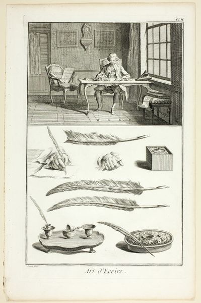 Benoit Louis Prevost's "Seal Engraving" from the Encyclopédie presents us with a detailed tableau of 18th-century craftsmanship, rendered in delicate lines and structured composition. The engraving is bisected into two distinct registers. The upper scene introduces two artisans within a domestic interior. To the left, a figure sits at a desk, meticulously working, while another tends to a hearth on the right. Below, the composition shifts to a display of tools, each rendered with precision. Prevost's engraving serves not only as a record but as an articulation of knowledge. In this context, each element – the artisans, the hearth, the tools – becomes a signifier within a semiotic framework, conveying ideas about labor, domesticity, and the Enlightenment's pursuit of systematized knowledge. The arrangement of the tools is not arbitrary but designed to communicate a sense of order and the rational classification of skills. This piece exemplifies how art, even in its instructional form, engages with broader philosophical concerns about the nature of work and the organization of information.