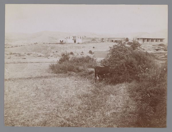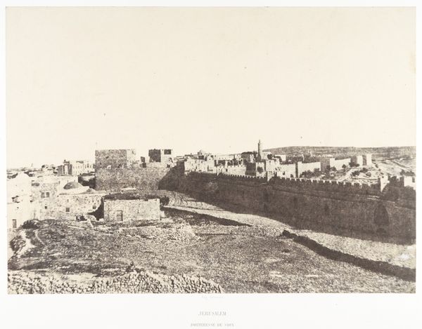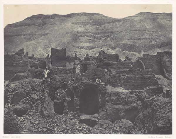 Curator: This captivating gelatin silver print transports us back to the Karnak Temple complex in Thebes. Taken between 1851 and 1852, it’s the work of Félix Teynard, capturing a general view of the ruins from the southeast. Editor: Wow, it's incredibly melancholic. All that sky pressing down on these crumbling, ghostly remnants. You feel the weight of centuries, the impermanence of even the grandest endeavors. Curator: Teynard wasn't just documenting; he was engaging with history, really. He's carefully composed a landscape brimming with symbolic ruin. Look how the lone obelisk pierces the skyline - a defiant finger pointing to a past glory. Editor: The obelisk feels significant, standing tall amidst all the chaos, like a petrified memory or a promise. Its shape mirrors that of a sun pillar, and connects directly to the life giving deity Ra, continuing a narrative even through the destruction. Curator: Absolutely. And note the almost scientific precision alongside this romantic sensibility. Photography at this time was still quite new, this technology used to catalogue Egypt’s ancient treasures for Western audiences. Editor: Yet, this image, like many ruinscapes, speaks more profoundly to human frailty than any mere inventory ever could. It acts as a warning of the transient nature of empires. See those heaps of hewn rock? They represent collapsed hubris and ambitions. Curator: I agree entirely. The photograph’s subdued palette adds another layer. It's as if the colors themselves have been weathered by time, mirroring the decay of the stones. And the angle, just elevated enough, makes one feel like an archeologist at a dig site. Editor: Exactly. An invitation to contemplate time itself, made through composition, angle, and tone. A single picture filled with an untold amount of loss. A powerful memento mori. Curator: It certainly leaves a mark. Makes you ponder what fragments of our own time will become poignant symbols in the far future.