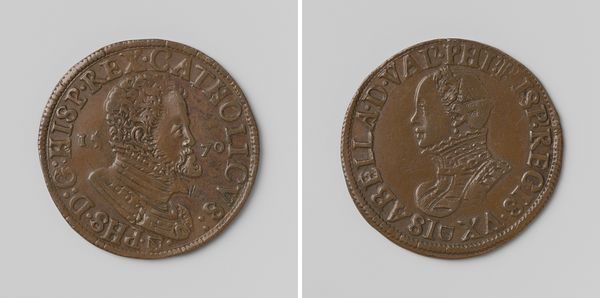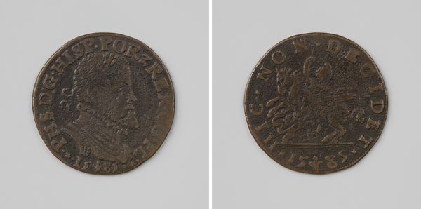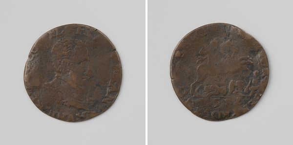 This copper medal commemorates the arrival of François-Hercule, Duke of Anjou, in the Netherlands. The composition is split across both faces of the coin, offering a contrasting view of power and allegorical representation. One side depicts a dynamic scene of figures, deeply etched. Notice the winged figure, possibly an angel or symbolic representation of victory, poised over a kneeling figure. The texture and line work here suggest movement and perhaps a divine blessing upon the Duke's arrival. Flipping the coin, we see a more static scene: standing figures alongside an heraldic symbol or column. The starkness of the imagery implies a sense of order and the formal establishment of power. The inscriptions encircling each side, in a semiotic system, frame the imagery and root it within a specific historical context. The coin’s design balances dynamism with static authority. It provides insight into the early modern European symbolic language of political power.