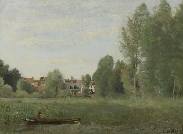 Editor: Here we have Paul Joseph Constantin Gabriël's "Landscape near Kortenhoef," an oil painting from 1877, currently residing in the Rijksmuseum. It strikes me as very subdued; the colors are muted, almost dreamlike. How do you interpret this work? Curator: That subdued palette speaks volumes, doesn't it? For me, this landscape evokes a deep connection to the Dutch Golden Age, but with a twist. Think about what a Dutch landscape traditionally represented – prosperity, connection to the land, the strength of the community. Yet, Gabriël seems to be moving away from those overtly nationalistic symbols. Do you notice any specific element that speaks to that? Editor: I see a figure walking by a traditional building. Is it intended to symbolize something other than a simple building? Curator: Precisely! That figure walking alongside that old tower makes me think of time. The way time both alters and solidifies the collective identity. While his contemporaries were embracing modern life, he chose to immortalize these simple, nearly timeless landscapes. Doesn’t it evoke a powerful sense of longing? What does it speak to you on a personal level? Editor: It is rather meditative and quiet, it makes me think about slow living. Curator: See, that’s what I mean! The subtle interplay of light, shadow, the earthy tones... it all speaks to a specific feeling that transcends just pretty scenery. He taps into a cultural memory. We can imagine how important the connection to our roots will be in the coming era. Editor: That's a fascinating perspective. I never considered the painting as a bridge between eras, more like a quiet study of nature. Curator: Art often has the capacity to tell about more than it initially seems, particularly when it plays with historical symbols. This exercise opened my eyes as well to think about how an image becomes associated with tradition or national identity.