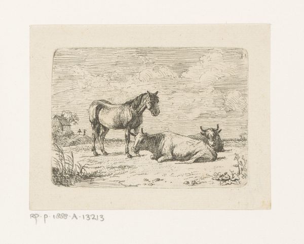Curator: Here we have "Horses" by Adam von Bartsch, created sometime before his death in 1821. Editor: They seem utterly exhausted. The saddles suggest work, but their stillness evokes a deeper weariness, a world-tired resignation. Curator: Horses, of course, have long symbolized nobility, power, freedom. However, Bartsch captures them at rest, perhaps mirroring the political exhaustion after the Napoleonic wars. Editor: And that tethered horse in the foreground. It feels so symbolic of restraint and the loss of autonomy after such a period of upheaval. Curator: Absolutely. The white horse may represent purity, while the darker one, duty. Bartsch's masterful etching captures these shifting meanings so subtly. Editor: I see the world reflected in them. Exhausted but still standing. Beautiful and powerful. Curator: I agree, a lasting commentary on resilience.
