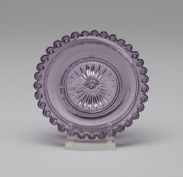 This vibrant blue cup plate, crafted anonymously, features a symmetrical design pressed into glass. The radial composition draws the eye inward towards the central star motif, a concentrated burst of geometric precision. Moving outward, one notices the carefully arranged floral patterns, curving and unfurling to create a dynamic yet contained space. These elements are neatly framed by an outer ring of circular indentations, adding both texture and definition to the plate’s edge. The plate is not merely functional; it embodies a play of form and pattern. The deep blue hue saturates the object, manipulating light and shadow to enhance the design’s depth. This intense coloration speaks to the plate’s decorative purpose, elevating it beyond mere utility. Consider how such an object destabilizes the boundary between the functional and the aesthetic, questioning fixed categories of value. The cup plate offers a study in symmetry, color, and tactile design that both pleases the eye and engages the mind.