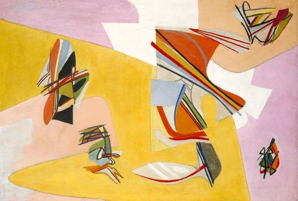 Curator: Oh, this one’s got my brain doing somersaults! It feels… like jazz on canvas. Sort of scattered but rhythmic, you know? Editor: We’re looking at an Untitled mixed-media collage by André Lanskoy. It embodies the spirit of modern abstraction, and its lack of a specific date encourages interpretations unbounded by temporal context. The use of collage also speaks to a fragmentation… a breaking down of traditional forms. Curator: Fragmentation is the perfect word. All these shapes…they’re like puzzle pieces from different puzzles all mashed together. But the palette is also very playful – the pinks, the blues, offset by this really striking, dominant black figure right in the center. It wants to be serious but can't help winking a bit, if you ask me. Editor: And the materials contribute to that tension, right? Collage introduces texture, materiality, an almost tactile quality that contrasts with the flatness usually associated with painting. It reflects broader socio-political anxieties around authenticity and representation. What is real? What is constructed? These are the questions implicitly posed by the medium. Curator: Constructed, yes. It's funny, because when I look at this I think less about art history and more about… life? You pick up bits and pieces of experiences and somehow assemble a narrative out of it all. None of it fits perfectly, and some elements just stubbornly refuse to integrate but, hey, there you have it, a portrait in a hundred shards. Editor: I think that’s an apt reading. There is something inherently incomplete about it – but this incompleteness challenges the authority of singular, fixed perspectives. Instead, it fosters a multiplicity of viewpoints and reminds us that identity itself is fluid. Even those pale water colours hint at fragility. Curator: Yes! Like fading memories. Though the confident brush strokes scattered here and there would deny weakness or submission. More like claiming autonomy in deconstruction… Okay, maybe my brain is doing a little gymnastics again. Editor: Its strength might be rooted in the lack of resolution – by inviting multiple perspectives this work of art avoids closing itself off or solidifying into ideological rigidity. And that, perhaps, is what resonates most powerfully for our times. Curator: I can see that… The best art demands dialogue. And even though Lanskoy is quiet on specific meaning here, he still gives us plenty to argue about with each other – and within ourselves, for that matter. It's unsettling in the best way, the colors pulling me to dream beyond myself and reality at large!