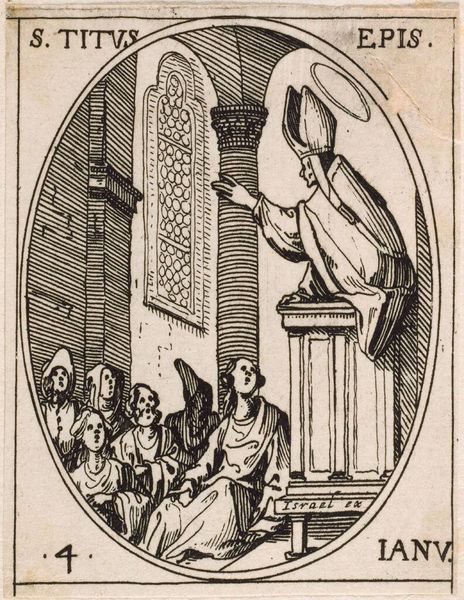 Editor: This is Jacques Callot's "Saint Martha," an etching from the early 17th century. The scene feels really tense with all these figures crowding around Martha. What sort of symbolism do you see in this image? Curator: The crowding itself is symbolic. Notice the active gestures and gazes. The group seems to indict Martha. She stands at a threshold, a symbolic gateway between the domestic and the divine. What memories or emotions does this scene stir in you? Editor: I guess, a feeling of being judged, maybe unfairly. Curator: Precisely. Callot cleverly uses the visual language of persecution. Even the architectural backdrop feels oppressive. Consider how such imagery functioned during the Counter-Reformation. Editor: I see. So, it's not just a portrait, but a loaded image carrying a lot of cultural weight. Curator: Exactly. The emotional power lies in its lasting symbolic language.