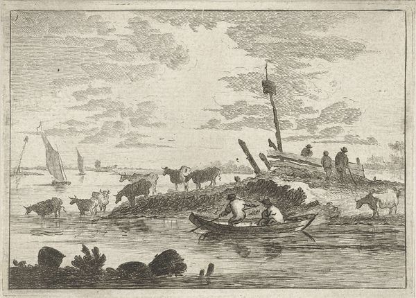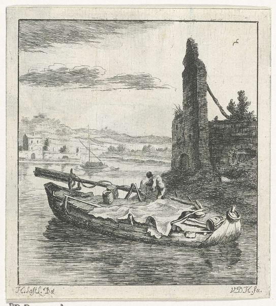 Anthonij van der Haer’s etching, “Vissers op een rivier,” captures a serene river scene with detailed figures and landscapes. The composition is carefully structured to draw the eye from the foreground, where fishermen are busily working, to the distant, softly rendered background. The artist employs a limited but effective range of lines to define shapes and textures, creating a sense of depth and space. The use of line is crucial here; it not only outlines the forms but also provides shading and detail. This technique, typical of etching, uses the stark contrast between the lines and the white paper to evoke a sense of light and atmosphere. The arrangement of the figures and boats distributes visual weight, balancing the composition. Through this orchestration of line and form, the artwork reflects the 18th-century interest in depicting everyday life, while also engaging with broader notions of landscape and human activity. This piece challenges viewers to consider the interplay between form and content, and how this dialogue shapes our understanding.