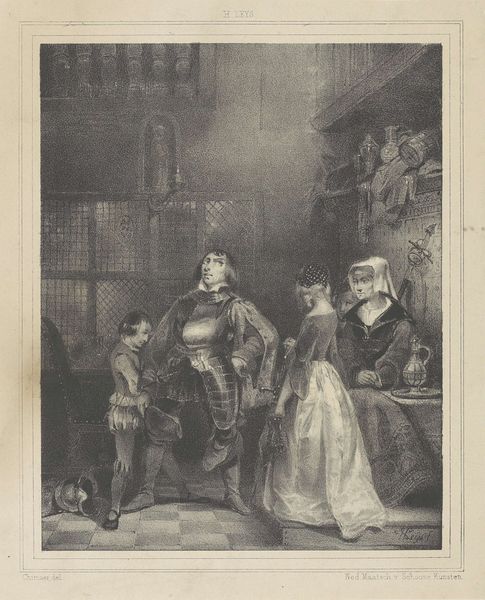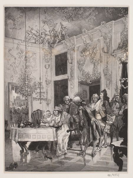 William Hogarth created this engraving, "King Henry the Eighth and Anna Bullen," with an intricate and detailed approach. The composition is dominated by a large interior space, defined by strong vertical lines of the windows and architectural elements, offset by the figures arranged in a shallow foreground. The tonal range, from light to dark, creates depth and emphasizes the textures of the costumes and interior décor. Hogarth uses this formal structure to explore ideas of power and drama. The figures are arranged almost like a stage set, inviting us to interpret their roles and relationships. The meticulous details in clothing and setting, typical of Hogarth, add layers of meaning, reflecting social and cultural codes of his time. Note how the artist uses line and shading to articulate each character’s expression and posture, subtly hinting at underlying tensions. Hogarth challenges the viewer to decode the complex interplay of signs and symbols, using the formal arrangement to convey a narrative. The artwork becomes a site for interpreting historical and cultural values, demonstrating how formal choices can encode complex meanings.