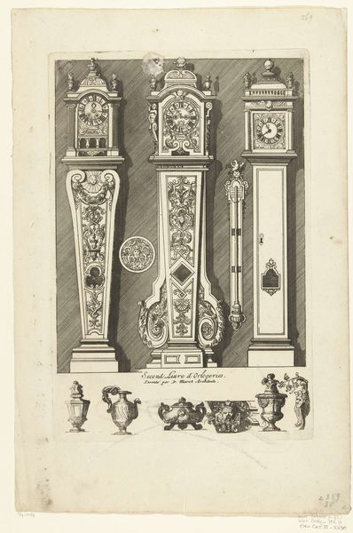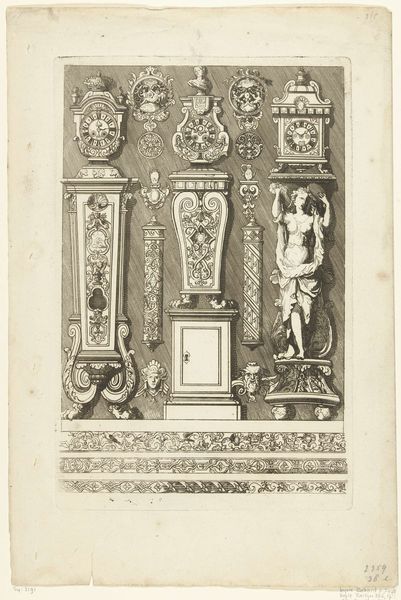 Editor: This is "Drie comtoise klokken en dertien kleinere motieven," a pre-1800 engraving now housed in the Rijksmuseum, created by an anonymous artist. I find the level of detail captivating, like peering into a watchmaker’s meticulously organized workshop. What story do you think this work is telling us? Curator: Well, considering the historical context, it speaks volumes about the rise of the bourgeoisie and their relationship with time. Before standardized time, communities relied on natural cues. Clocks, especially ornate ones like these, became status symbols. Editor: So, owning a clock wasn’t just practical; it was a way of displaying wealth and power? Curator: Precisely. Look at the baroque detailing – the flourishes, the engravings. These weren’t mass-produced items; they were crafted, each reflecting the owner’s status and the artistry of the maker. This print then circulates the designs, making them more widely accessible, at least visually. What does that suggest to you? Editor: It's a way of democratizing design ideas, right? Even if you couldn't afford a clock like this, you could still appreciate the aesthetic, or maybe aspire to own one someday. It's interesting how prints played a role in spreading artistic and technological knowledge. Curator: Exactly. Think about the public role of prints at the time, how they influenced taste and desire. And also consider the power dynamic – who had access to these images, and what messages were being subtly conveyed about social hierarchies. Editor: I never thought about clocks in terms of power and social standing before. Curator: That’s the beauty of art history – it’s not just about aesthetics, it’s about understanding the forces that shape our world and how even something as seemingly mundane as a clock becomes embedded in a web of cultural meanings.
