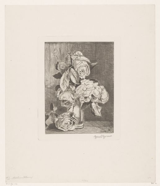 Ferdinand Oldewelt rendered 'Viooltjes in een vaas' as an etching. Oldewelt, who lived through significant social and political changes in the Netherlands, navigated his artistic path through a shifting cultural landscape. This quiet still life, with its subdued tones and delicate lines, reflects the sensibilities of its time while subtly questioning the traditional role of women in art. The flowers, confined within the vase, may evoke the limited opportunities afforded to women. However, their vibrant presence could be seen to symbolize the quiet strength and resilience of women within those constraints. The intimate scale of the etching draws us into the piece, inviting contemplation on the significance of everyday objects. What might seem merely decorative subtly raises questions about societal expectations. 'Viooltjes in een vaas' invites us to reflect on the untold stories and experiences of individuals.