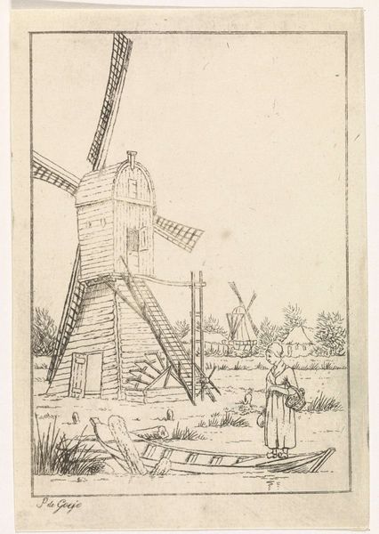 Curator: Standing before us is "Landscape with Windmill," an etching by Alexander Schaepkens, likely created sometime between 1830 and 1899. Editor: Oh, I love this! It’s like stepping back into a quieter time. So simple, but evocative. I immediately imagine the whoosh of the sails turning and the smell of the grass. Curator: Exactly! And you see how he used line? It’s so economical, isn’t it? You get a real sense of depth with such a minimalist approach. Consider that during this period, landscape art served as a mirror reflecting cultural values related to nature, progress, and the evolving industrial society of the Netherlands. Editor: True, it is deeply evocative of a changing world. It is charming to see the windmill almost celebrated here as a marker of that very shift in landscape! I wonder what it felt like back then, though? Seeing these huge structures pop up everywhere. This tiny image suddenly seems quite monumental. Curator: These windmills were the backbone of the Dutch economy and integral parts of the landscape, yet sometimes became objects of concern due to industrialization changing traditional lifestyles and threatening local autonomy. Prints like these democratized access to imagery; they brought slices of the Netherlands to people far and wide, influencing not only national identity but artistic expression as well. Editor: Like little postcards. So, this artwork could be seen as a commentary on industry AND landscape preservation perhaps? That it can both represent national pride and cultural anxiety is quite complex! Makes you consider how art creates such a cultural conversation, generation to generation. Curator: I completely agree. The social and political context imbues even what seems like a simple scene with depth. It is about more than nostalgia for the pre-industrial world. What begins with line on copperplate becomes part of the political, ideological, and artistic bloodstream of an era. Editor: It certainly gets you thinking! Like how technology changes not just the view outside the window but the view we hold inside ourselves. A beautiful paradox wrapped up in simple lines.