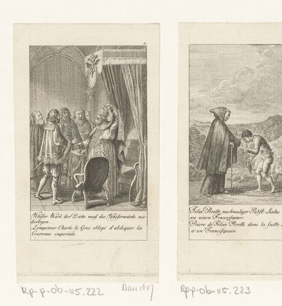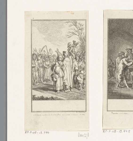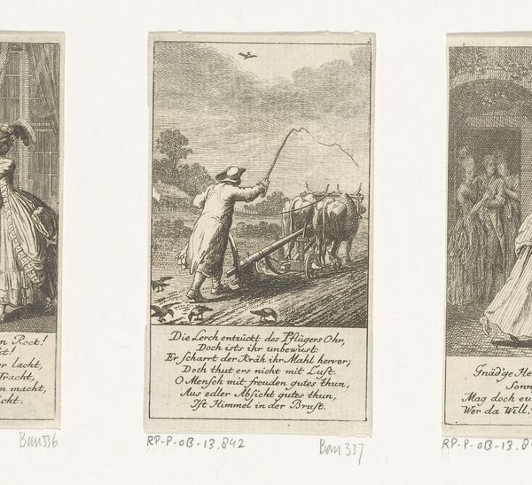 Editor: This is "Juli," an etching by Daniel Nikolaus Chodowiecki from 1777. It shows women working in a field, perhaps harvesting. It has a documentary feel but seems a bit staged somehow. What do you see in this piece, especially considering the period? Curator: Well, the "staged" feeling is interesting, isn't it? We're seeing rural life depicted, but it's idealized through a Romantic lens. While appearing to depict everyday labor, Chodowiecki likely catered to an urban, bourgeois audience far removed from the realities of agrarian work. Editor: So, not exactly a mirror of the lived experience for rural women? Curator: Precisely. This image performs an interesting balancing act. There is text included which highlights the circumstances for young women - suggesting urgency around "opportunity". There's this performative nod towards the value and virtue of labor, while also potentially reinforcing existing class structures. Are we meant to sympathize, admire, or perhaps something in between? Consider what that implied about access, mobility, or lack thereof. How does it sit with you knowing it comes from a time when societal roles were so strictly defined, particularly by gender and class? Editor: That's a great point. I initially just saw a historical snapshot, but now I see the potential complexities and social commentary. I appreciate you calling attention to the relationship between class, labor, and virtue as potential, intertwined aspects of this artwork. Curator: Exactly! Considering these multiple intersecting power dynamics makes the viewing experience that much more rich and revealing. It’s these layered contexts that transform a simple image into a powerful artifact, reflecting not just what *was*, but how it was *perceived* and *propagated*.