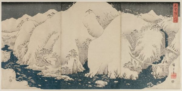 Curator: Before us hangs "Mountain River on the Kiso Road," a woodblock print possibly dating from 1857-1858, by Utagawa Hiroshige, and currently residing at the Minneapolis Institute of Art. Editor: The first thing that strikes me is the incredible sense of quiet. Despite the vastness of the snowy landscape, there's an intimacy in the way the river winds and those little pines cling to the mountainside. The colour palette feels so restrained yet dynamic. Curator: Indeed. Hiroshige was a master of ukiyo-e, or "pictures of the floating world." His landscapes weren't just about pretty scenery; they captured the everyday life and journeys of people in Edo-period Japan, framed within the complex politics of image creation and dissemination of the era. These prints were, in effect, carefully curated visual products aimed at particular social groups and marketplaces. Editor: Absolutely, and it’s important to acknowledge the physical labour involved. We’re talking about complex wood carving and printing techniques that often involved entire workshops. Each print, potentially part of a large run, carries evidence of that collective material effort, a sort of pre-industrial mass production using craft processes. The grain of the wood is almost present in the image itself. Curator: Precisely. And that connection to everyday life extended beyond the production process to the content. The Kiso Road was part of a network of highways connecting Edo – modern Tokyo – with other regions. Hiroshige’s prints of these routes catered to a burgeoning tourist culture and served as both souvenirs and representations of the Shogunates efforts to control culture. Editor: You see it almost as propaganda! For me the power is in the treatment of the landscape itself. The materials used to create that specific shade of blue in the river, for example – what were they, where did they come from? Knowing more about those raw materials tells us more about international trade, about networks of supply and demand during the period. That makes the appreciation deeper. Curator: I find myself agreeing with that more grounded take; while recognizing that, it's impossible to disregard the complex social networks they tap into, influencing aesthetic perceptions to our modern world. Editor: A beautiful convergence point to reflect on! Thanks.