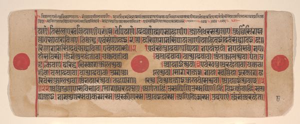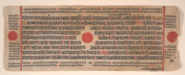 Curator: This leaf from a 15th-century Kalpa Sutra, currently residing in the Metropolitan Museum, is a fascinating object. Seeing these Jain rituals illustrated in ink and watercolor on paper offers so much to unpack. What strikes you most about it? Editor: I’m really drawn to the dense, almost overwhelming, text interspersed with those simple red circles. The contrast is quite stark. I am wondering what the presence of so much text communicates in relation to those few dots? Curator: The text is paramount; this is a religious manuscript, after all. But you're right, the red circles, known as *bindus*, serve a critical function. In the context of manuscript illumination from Western India during that period, it is interesting that we note that the use of a strong, bold red was commonly used as a device in this socio-historical context. This choice probably points us to the historical context, highlighting significant breaks or divisions within the text, guiding the reader through complex narratives. Why do you think standardization became a key part of Jain manuscript? Editor: Perhaps, the act of standardizing these illustrations was crucial to maintain doctrinal purity and to assure patrons of consistent quality? Curator: Precisely. The patronage of merchants and the burgeoning book trade influenced artistic production significantly. Now, consider the role of institutions like the Met in shaping our understanding of this object. The way the museum displays and interprets this artwork undoubtedly affects its meaning and value. What might be lost in the transition from a sacred object to a museum display? Editor: Maybe the original, personal connection that the user has would get lost or replaced, because the new encounter is filtered through museum protocols and scholarly interpretations instead of directly through religious practice. That is helpful. Thanks for guiding me to examine how institutions and society together have influenced artistic value. Curator: Absolutely, by thinking critically about context and presentation, we move towards a more nuanced and profound understanding.