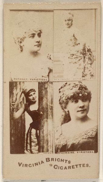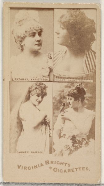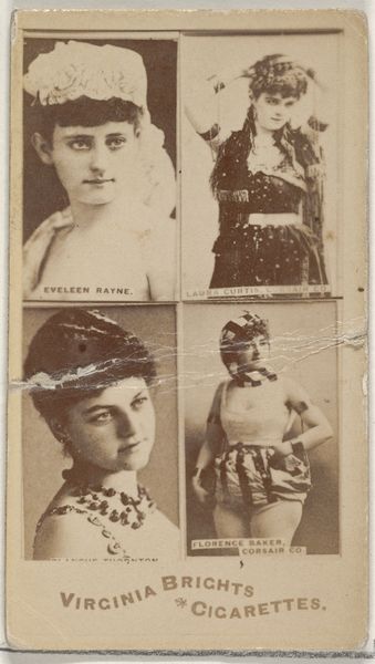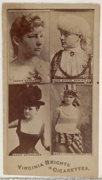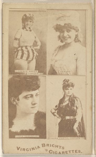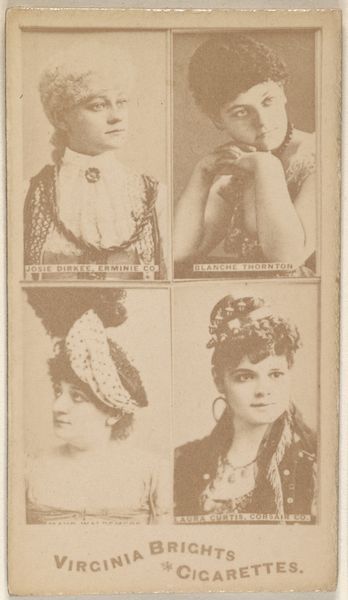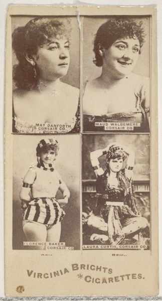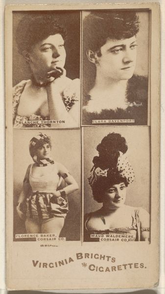 Editor: So this print, "May Danforth, Corsair Co./ Florence Baker, Corsair Co./ Maud Waldemere, Corsair Co./ Verona, from the Actors and Actresses series (N45, Type 4) for Virginia Brights Cigarettes," dating from the late 1880s by Allen & Ginter… it feels very much of its time, in terms of style, doesn’t it? How would you unpack the iconography at play here? Curator: Indeed. The framing, grouping four figures together like this immediately puts me in mind of earlier religious iconography. Think of depictions of the four Evangelists. By using this visual structure, the distributors imbue these actresses with a certain elevated status, aligning them with culturally revered figures, however playfully. Editor: Interesting. So, you see the commercial use of religious structure in this cigarette card format? Curator: Precisely! Each woman's image also carries its own symbols. For instance, consider Maud Waldemere's demure profile juxtaposed with Verona's direct gaze and almost challenging smile. These choices were undoubtedly intentional, crafting personas that would resonate with diverse viewers and thus boost sales. What might these theatrical roles mean for their status and the period? Editor: I hadn’t considered that each woman could represent a particular desired archetype for the consumers. I suppose it’s playing with ideas of both aspiration and fantasy. Curator: It is, and by aligning these actresses with the ritual of smoking, the cigarette company creates an alluring association in the consumer's mind. It elevates a simple habit to something more... glamorous. A transgressive ritual! Editor: That makes sense. I guess I see a whole different side of cigarette cards now. I’ll never look at them the same way.