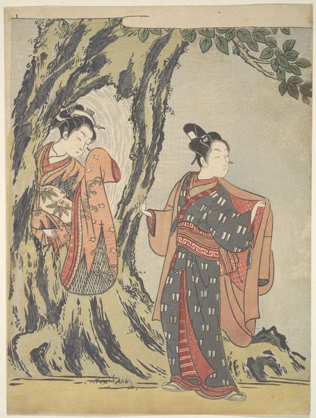 Editor: Here we have Torii Kiyomitsu's "The Actors Ichikawa Komazo I (L) and Nakamura Matsue I (R)," a print from around 1770. It depicts two figures under an umbrella, perhaps caught in a private moment. What cultural narratives might this image be echoing? Curator: Exactly. This Ukiyo-e print offers us a glimpse into the celebrity culture of Edo-period Japan. It portrays popular Kabuki actors not just as performers, but as figures deeply embedded in the social and cultural fabric. Kiyomitsu's work reflects the rise of the merchant class and their embrace of theater and the arts. The print is both aesthetic object and a document of celebrity. Editor: It's fascinating how it captures the 'celebrity' aspect! How does the composition contribute to this narrative? Curator: Consider how the umbrella frames the figures, creating an intimate space in the bustling city. This enclosed space heightens the tension and awareness of societal expectations around class and gender. Furthermore, what could be said about the gaze of each of the figures? Are they making a commentary of the other, the viewer, or even on themselves? Editor: I see what you mean; the expressions and subtle details create this unspoken narrative about celebrity, gender roles, and the gaze. Curator: Precisely. By acknowledging these historical and social elements, we may grasp how this seemingly straightforward artwork provides commentary regarding celebrity, class, and the social structures of its day. What appeared to be an everyday moment is actually a careful reflection of society, presented and perpetuated. Editor: I had no idea there were so many layers within this artwork. Curator: Absolutely! Exploring such pieces not only enriches our comprehension of history but also encourages us to question preconceived notions about art and society. Editor: Definitely food for thought. Thanks so much!