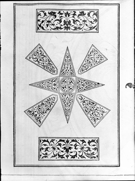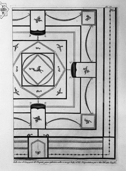 Editor: This is "Meander to the floor in mosaic found in the country house," a print by Giovanni Battista Piranesi. I am struck by how this pattern evokes a sense of order. The geometric elements seem meticulously placed. How do you interpret the work's visual structure? Curator: Indeed. Observe how Piranesi employs the geometric. The square grid, subdivided into alternating triangles and punctuated by rosettes, creates a compelling interplay of positive and negative space. The surrounding meander pattern serves as both frame and counterpoint, a contrasting rhythm to the central tessellation. Editor: It's interesting how the monochrome palette impacts our reading of form and space. Do you find this restricting or does it allow us to appreciate the pure geometry? Curator: The monochromatic choice, inherent to the print medium, forces us to engage directly with the formal elements. There is an elegant austerity, reducing the design to its foundational structure of line, shape, and repetition. Color could, arguably, dilute the power of these forms. Do you agree? Editor: I think you're right. It also speaks to the essence of Neoclassicism. Looking closely, one notices variations in line weight within the engraving. Is there significance in this variance of line? Curator: Undoubtedly. Consider it not merely representational but also expressive. The deliberate thickening and thinning of lines creates visual texture, almost simulating the tactile quality of the mosaic itself, further highlighting the design and overall form of the image. Editor: I hadn't considered that, that's so interesting! Thinking about it that way gives the mosaic form and dimensionality beyond the surface. Curator: Precisely. Such attentiveness to form reveals the rigorous intellect that shapes this seemingly simple composition. Editor: Thanks, that really opened my eyes to seeing the intricacies of form! Curator: My pleasure. It’s always rewarding to dissect these foundational structures of visual language.