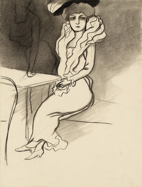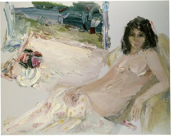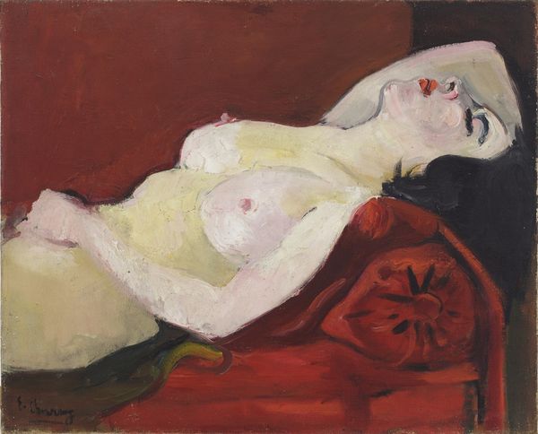 Alexandre Jacovleff made this painting of a model, seated on a bed, with oil paint on canvas. It's a kind of study, or a snapshot of a moment, rendered with loose brushstrokes and a pared-down palette. Look at the way Jacovleff layers pinks and reds to create the figure’s skin. It's not about perfection, but about capturing the essence of the pose, the weight of the body, and the intimacy of the scene. The brushstrokes are visible, thick in some places, thin in others, revealing the artist's hand and the process of painting. I love how the figure and the patterned backdrop kind of merge, creating a flattened space. And that tiny red 'W' on the model's chest, a quirky little detail that adds a touch of humor and humanity. It reminds me a little of Bonnard, in its intimacy and its embrace of the everyday. It’s a good reminder that art is a conversation, constantly borrowing and building upon what came before.
