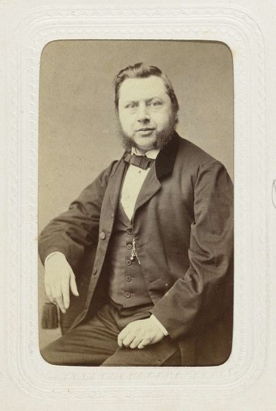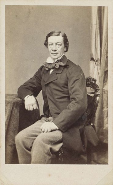 Editor: So, this is a studio portrait of a man sitting in a chair at a desk, believed to be created between 1863 and 1866 by Albert Greiner. It's a gelatin silver print. There's a solemnity to the image; it feels very posed and formal. What stands out to you? Curator: The sitter's carefully arranged posture speaks volumes about the emerging culture of photography in the mid-19th century. Consider the social context: Photography was becoming increasingly accessible but remained a significant event, often signifying upward mobility or status. Editor: So the act of having a portrait taken was important in itself? Curator: Precisely. Look at the man's attire: a suit, bow tie, watch chain – each detail meticulously chosen to project a certain image. The ornate chair and desk further enhance this impression of respectability and success. Photography offered a democratizing force but it could also perpetuate the ideals and aspirations of the middle class. Do you think the image does that? Editor: I think so, yes. But it's also interesting how standardized the posing is; he’s almost a type rather than an individual. Curator: And that is key. Early photographic studios had to establish certain codes of representation that were seen as appealing by the target demographic. It becomes about performativity of self as a form of social mobility. So while it looks candid, it may simply be what fit in during that moment. Editor: I never thought about photography in this way before. I was seeing it as an expression, but you framed it as a way of participating in society. Curator: Precisely! Looking at art history as intertwined with societal narratives brings new meaning to seemingly simple pieces, as the case is with Albert Greiner's picture.